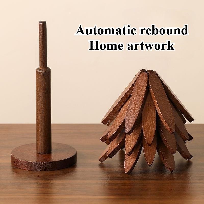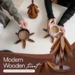 This wooden trivet set features a foldable tree-style stand.